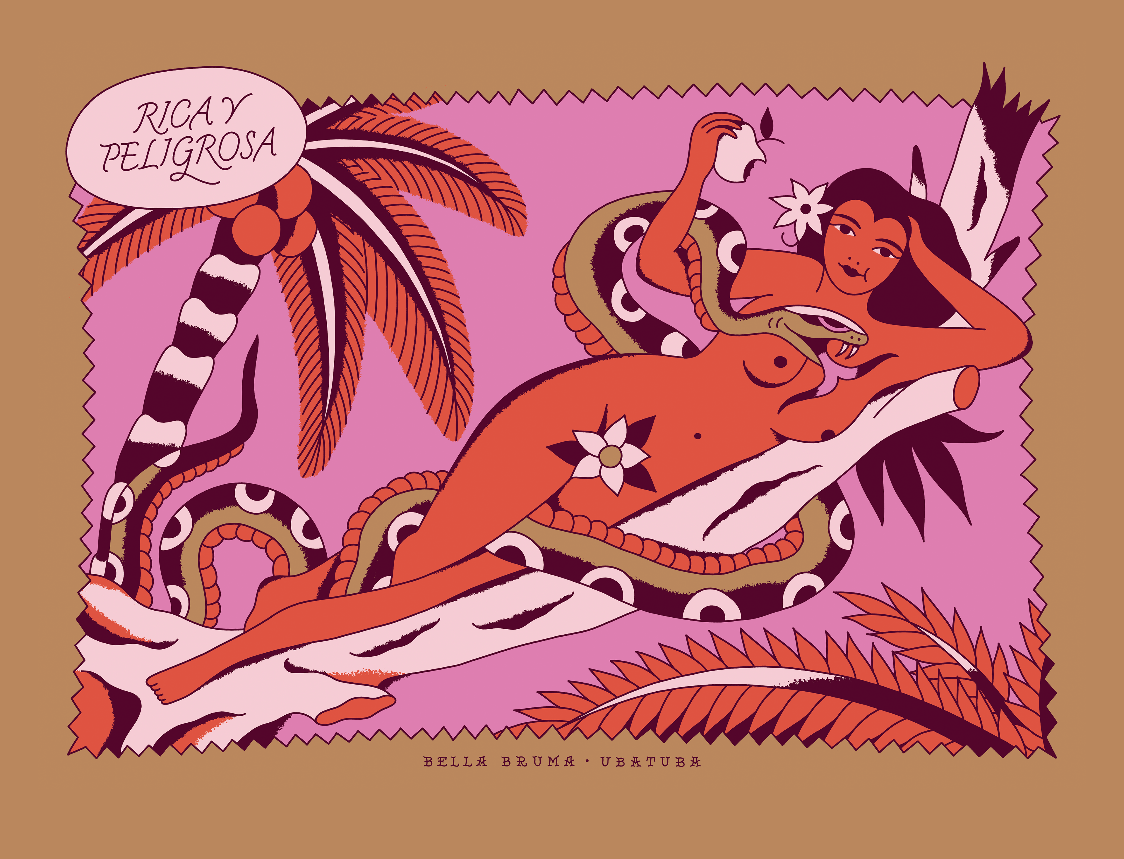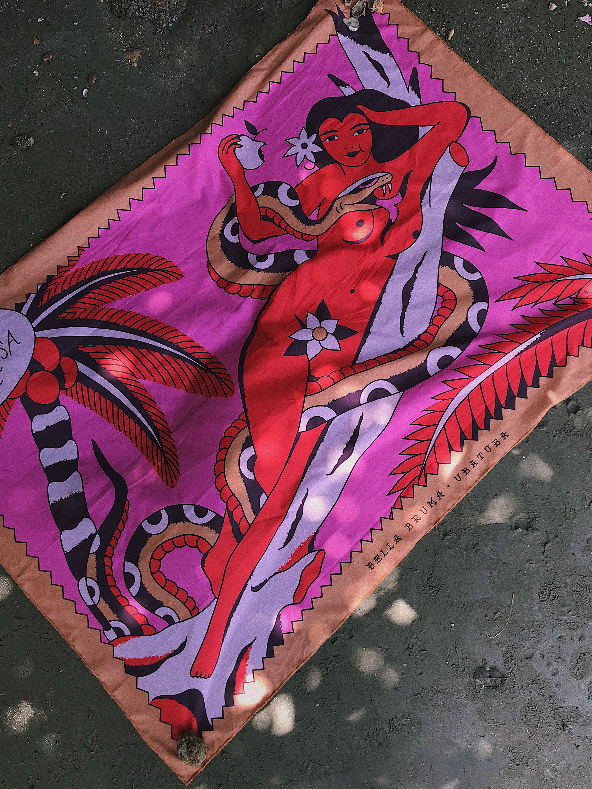 Rica: aquela que esbanja saúde, transborda beleza, acumula amigas, e cuida do próprio dinheiro. Rica é aquela que vive. Perigosa: aquela que é livre, que questiona, que busca conhecimento, que se vê e se ama sem culpas. Perigosa é aquela que sabe. A Canga Eva conta a história da Cobra, da Mulher, da Árvore e da Fruta, todas partes de nós, conselheiras, astutas, curiosas, amigas, criadoras, nutridoras, e sábias. Um convite do Bella Bruma para viver momentos de prazer e alegria junto ao Sol ou à Lua. Viva o momento em que a gente estende uma canga e se deita para olhar o céu.