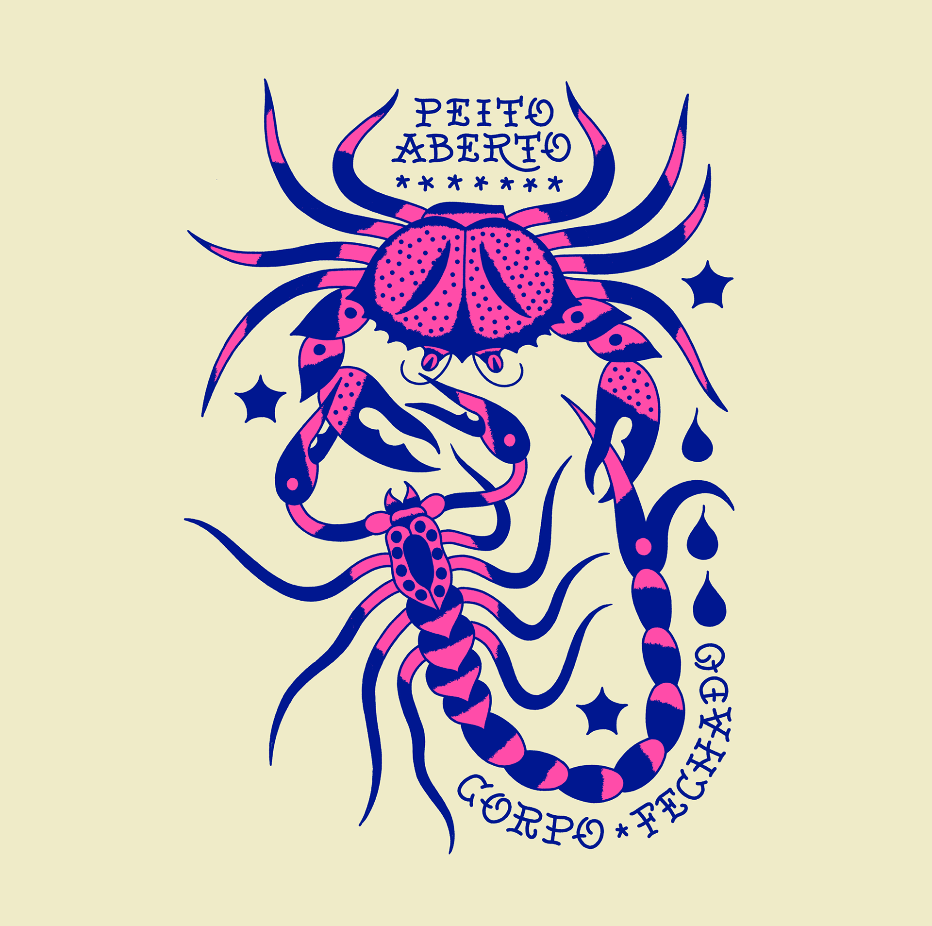 Que ao sair da sua zona de conforto e jogar o seu corpo no mundo, você se encontre, encontre com seus semelhantes e aceite as diferenças. Se proteja, se permita. O encontro do Caranguejo com o Escorpião simboliza aqui o crescimento, para deixar o ninho é preciso coragem, seu corpo é sua casa, sua arma, seu instrumento para sentir. Para viver é preciso buscar novos campos, perambular e se relacionar, esteja sempre de Coração Aberto e Corpo Fechado.
