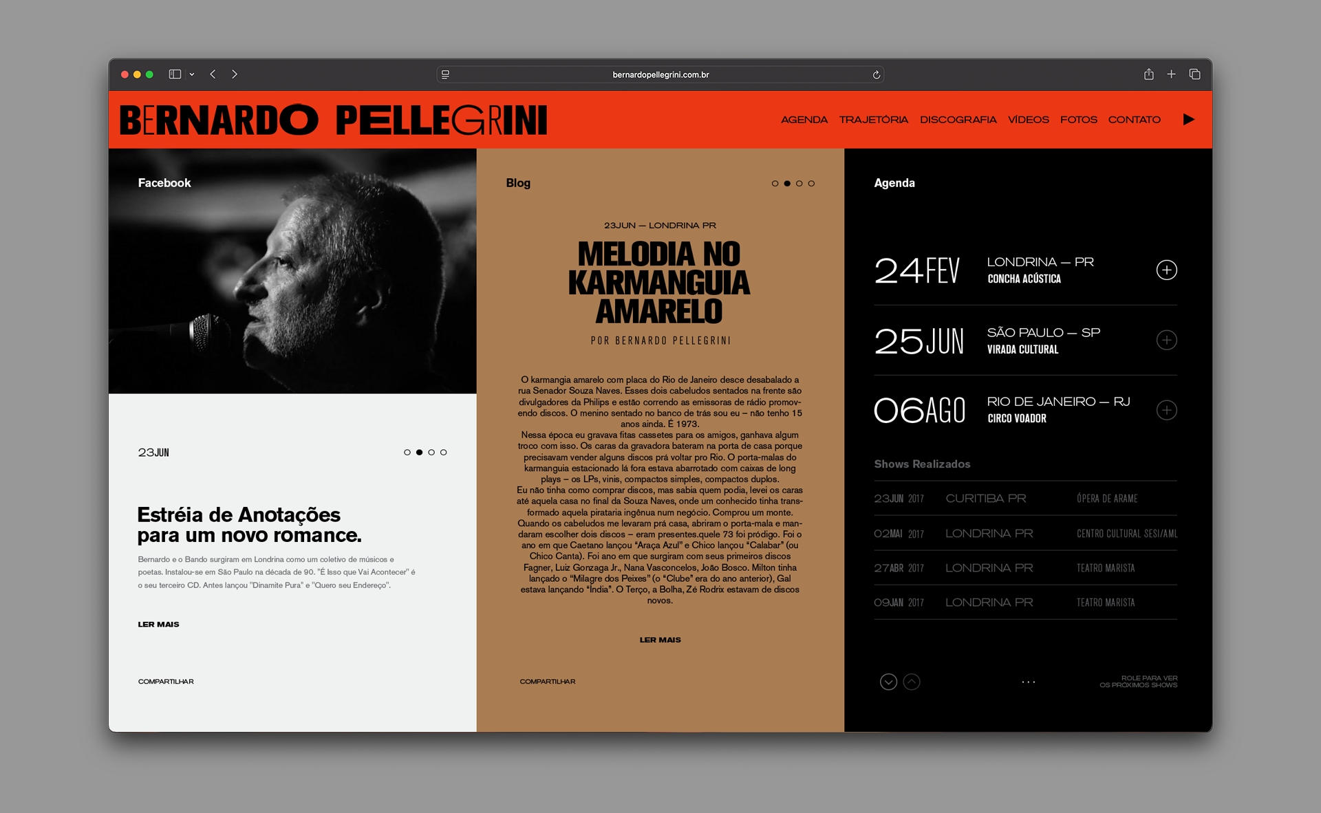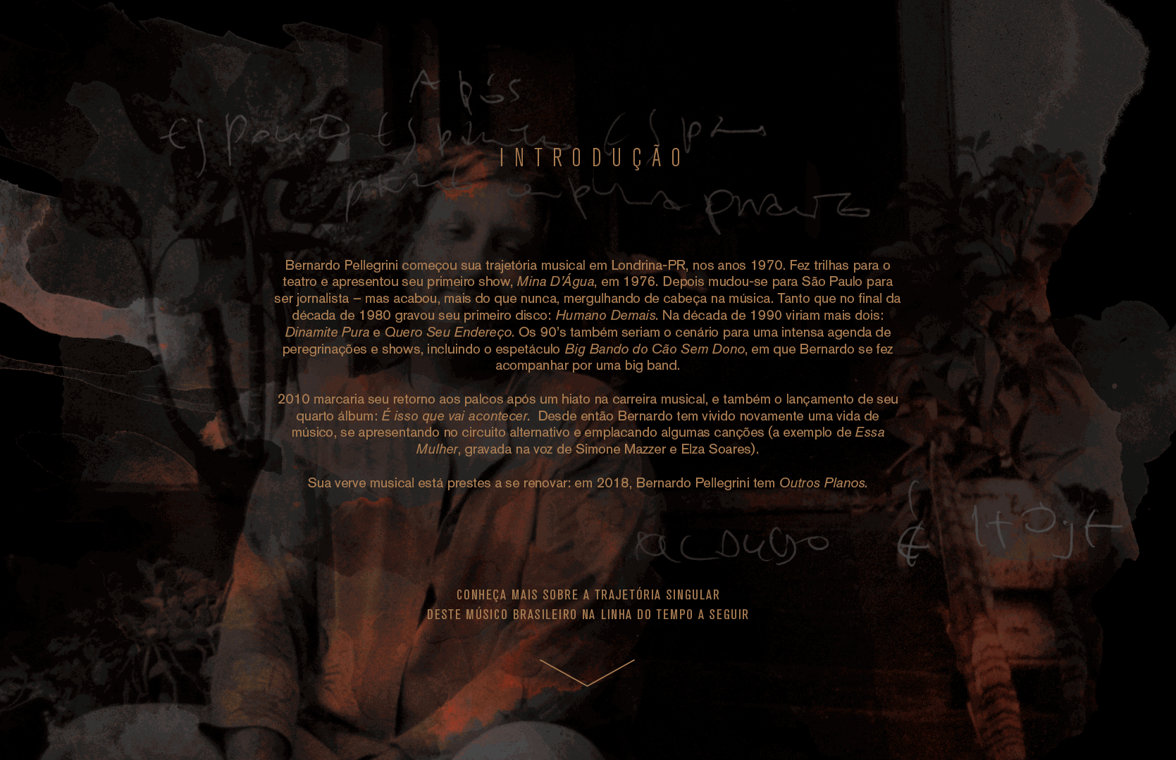 A diverse and restless personality, Bernardo synthesizes his passions, critical spirit, keen worldview, affections, personal relationships, and conflicts in the art of song, which seeks the perfect symbiosis between words, music, and voice. He composes songs that are snapshots of our turbulent and fast-paced times.