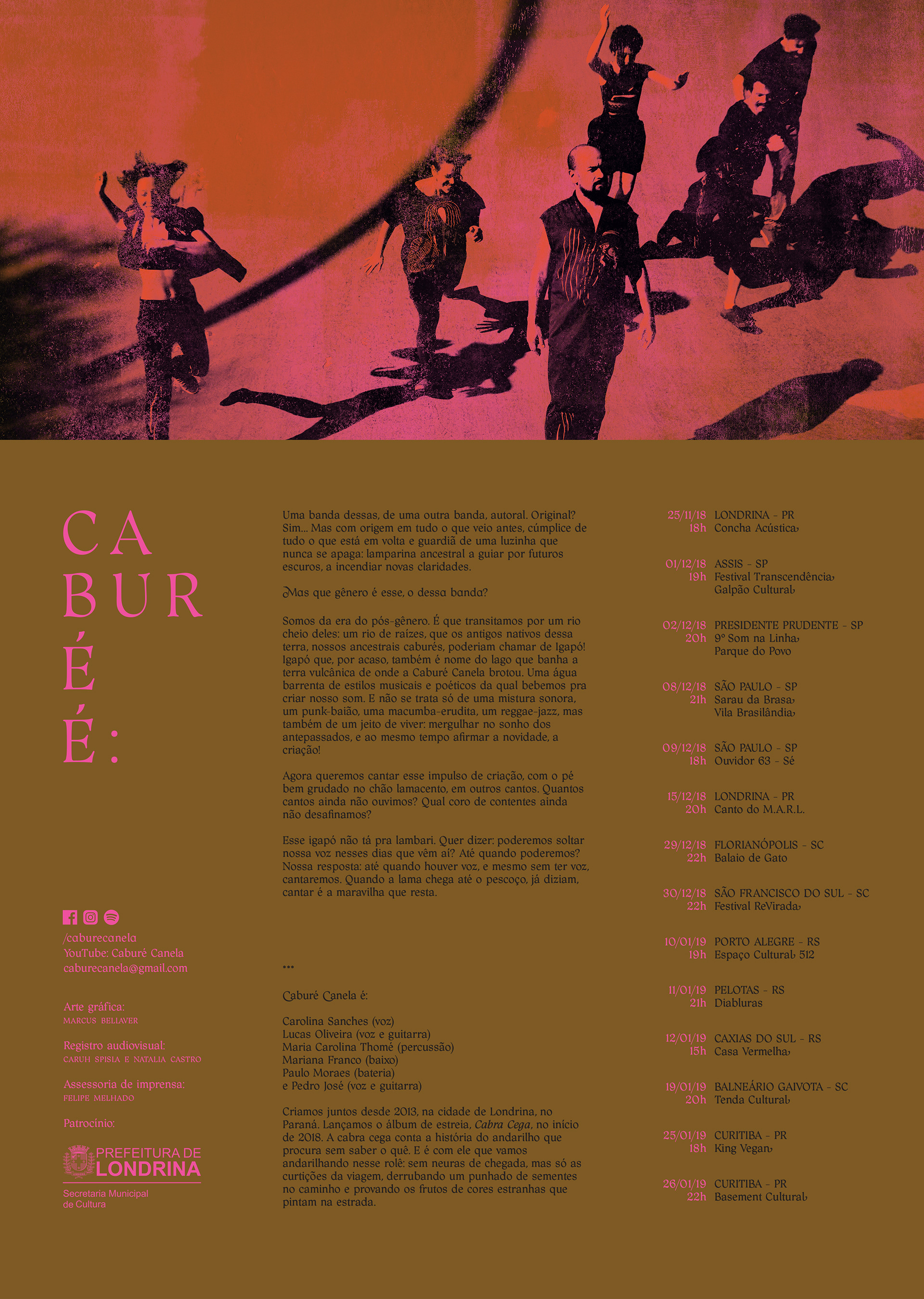 Caburé Canela is a band from Londrina that was formed in 2013, formed by Carolina Sanches, Lucas Oliveira, Maria Carolina Thomé, Mariana Franco, Paulo Moraes, and Pedro José.