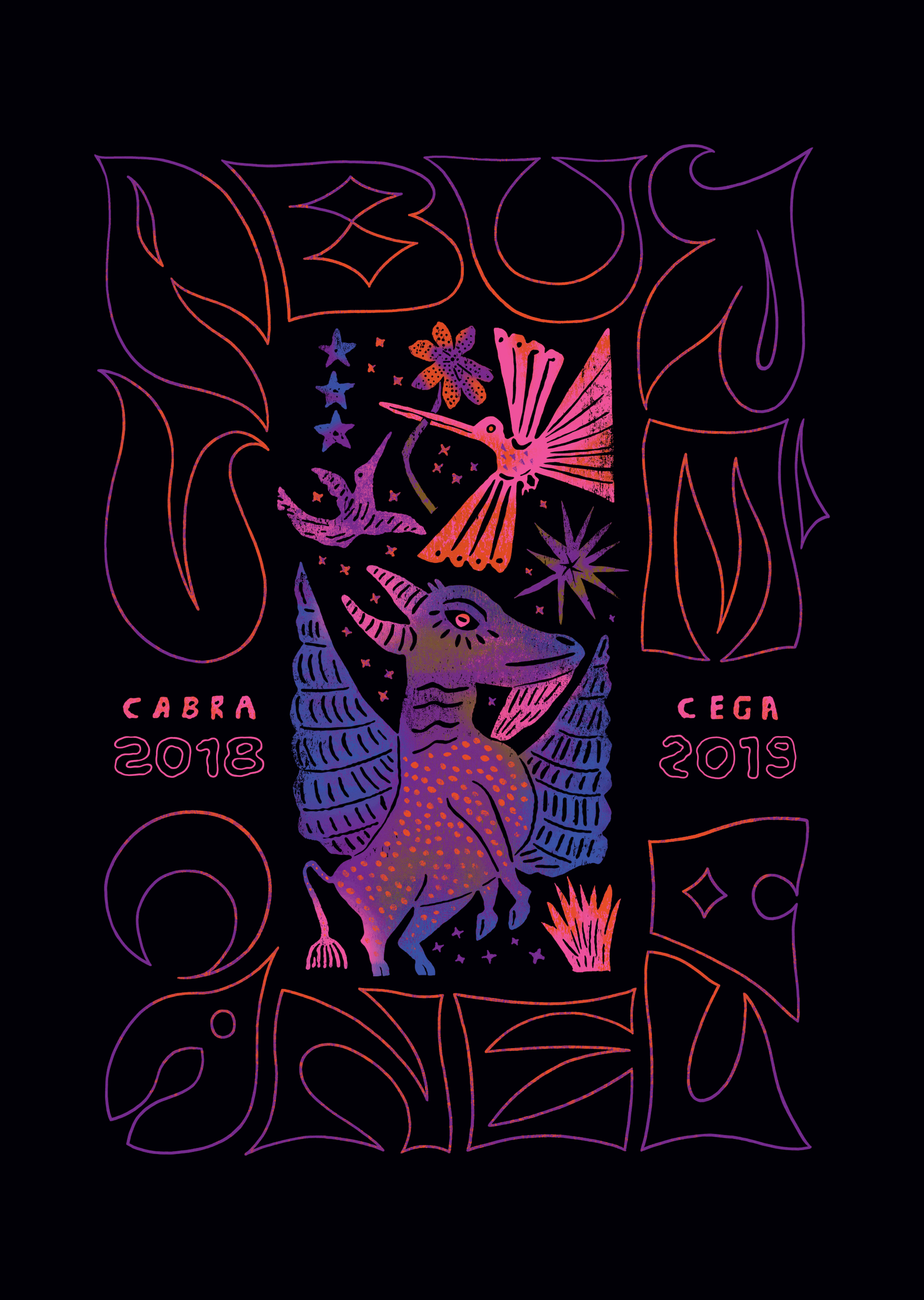 The wanderer from the depths of the world who carries in his chest something of surrender, in search of who knows what, crosses the center of the tsunami, hitches a ride on the whale's song, penetrates the absolute nothingness, and realizes that, unintentionally, a handful of seeds dropped along the way have sprouted among rocks and thorns. The graphic art that announces this journey is a remix composed from the unmistakable woodcuts of J. Borges, a Brazilian artist and poet, one of the masters of popular culture in the Northeast, and a living heritage of Pernambuco. The mix between the surreal tropical introverted urban pop, the extroverted shy sarcastic cursed, and the controversial Afro psychedelic rural unusual, encompasses the guidelines for the creation of this aesthetic atmosphere. The rest is just a journey.