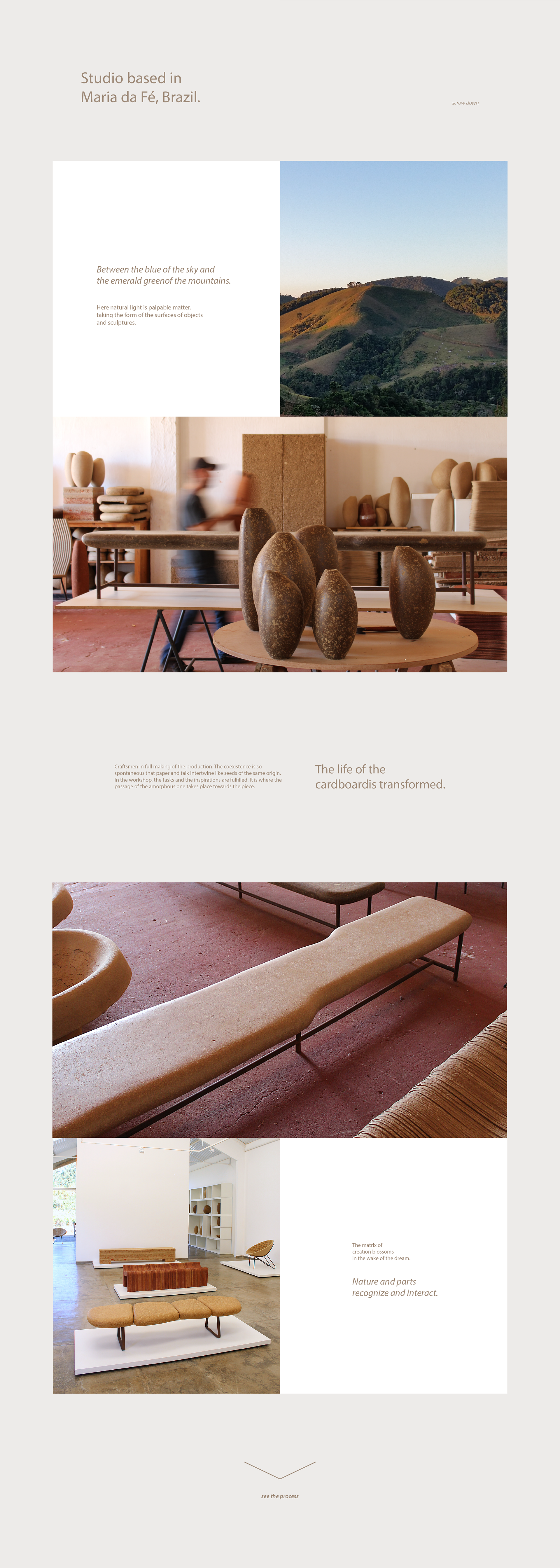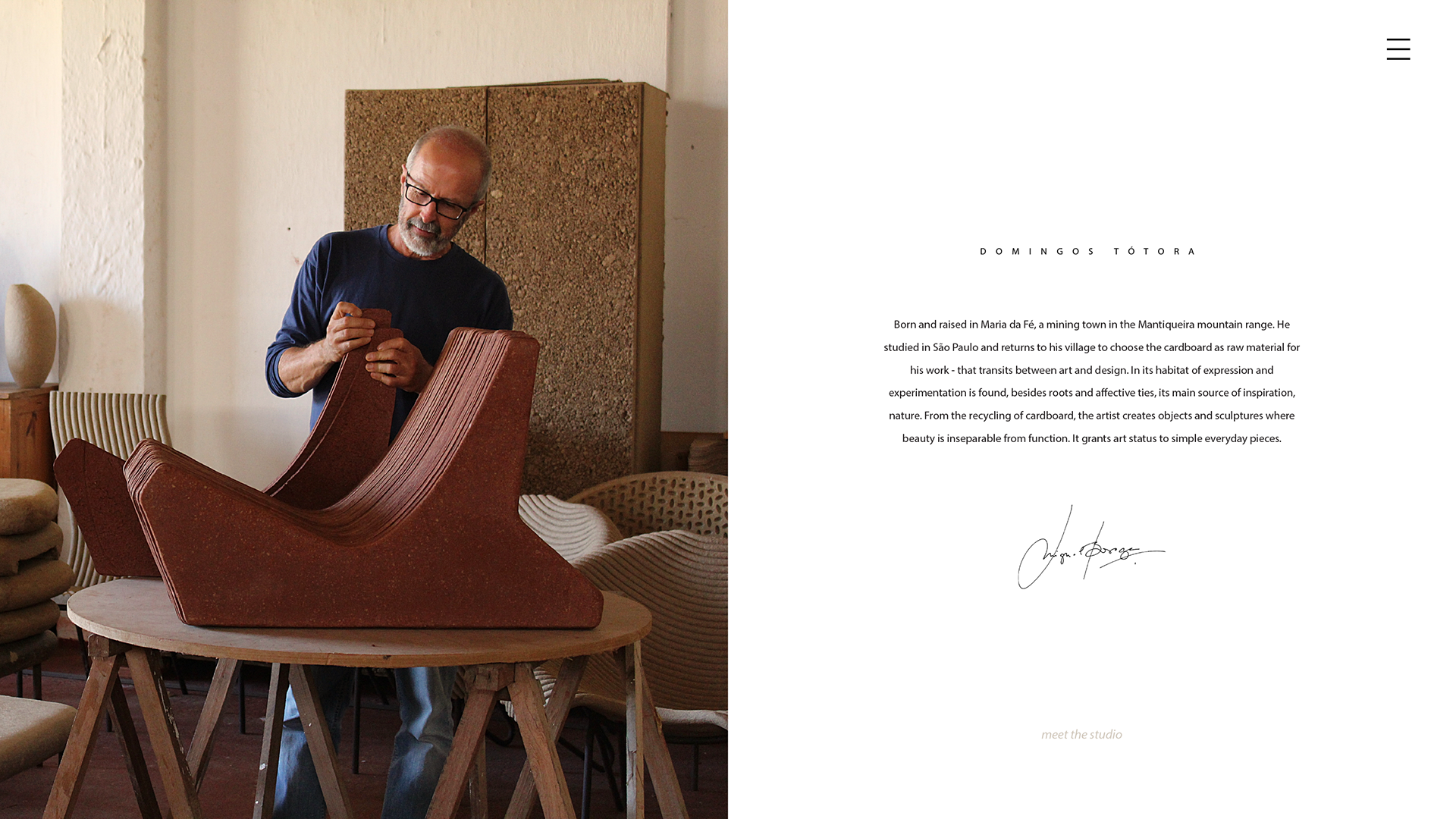 With a 17-year career, designer and artist Domingos Tótora lives and creates through nature. Domingos Tótora, from Minas Gerais, set up his studio in his hometown of Maria da Fé to be close to his greatest inspiration. With the concept of sustainability, embraced by many Brazilians, Domingos Tótora creates his designs from recycled cardboard, which he molds into benches, vases, and tables, and imitates stone and wood. Internationally renowned, Domingos Tótora teaches sustainability and loves nature through his creations.