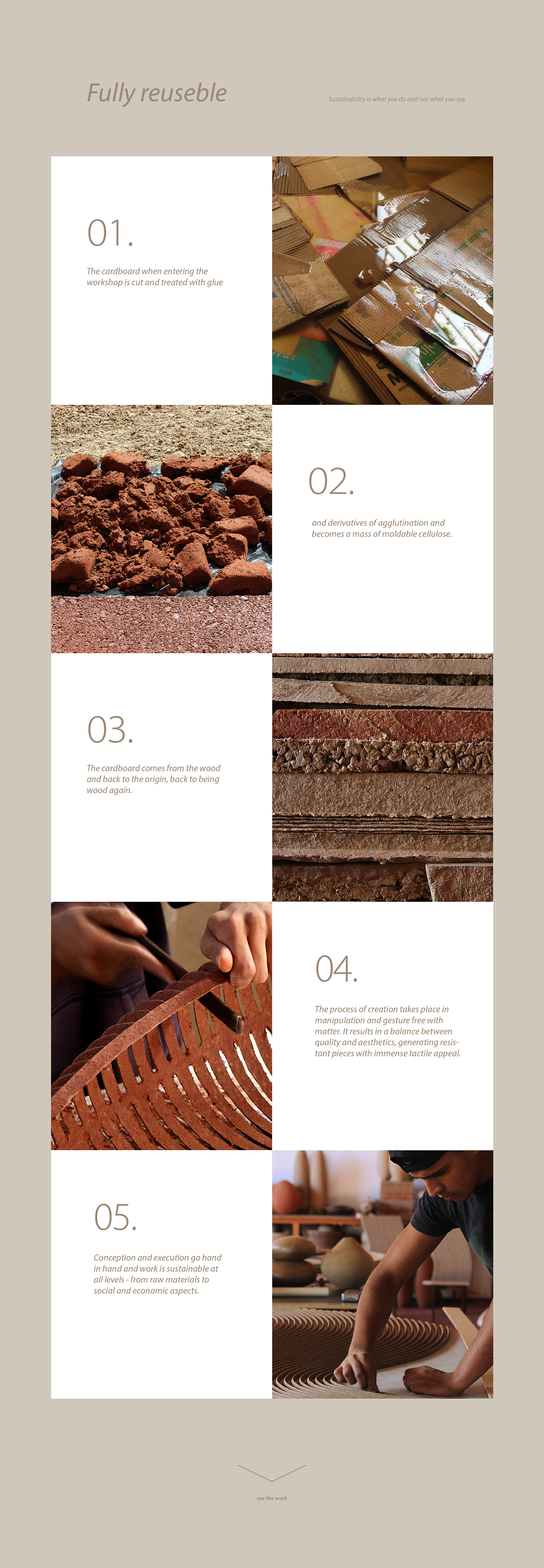The beauty of his work manifests not only in the final product but also in the process itself. Everything from the artist’s philosophy and respect for the environment to his production process reflects Domingos’ sensitivity, awareness, and deep connections to his roots.