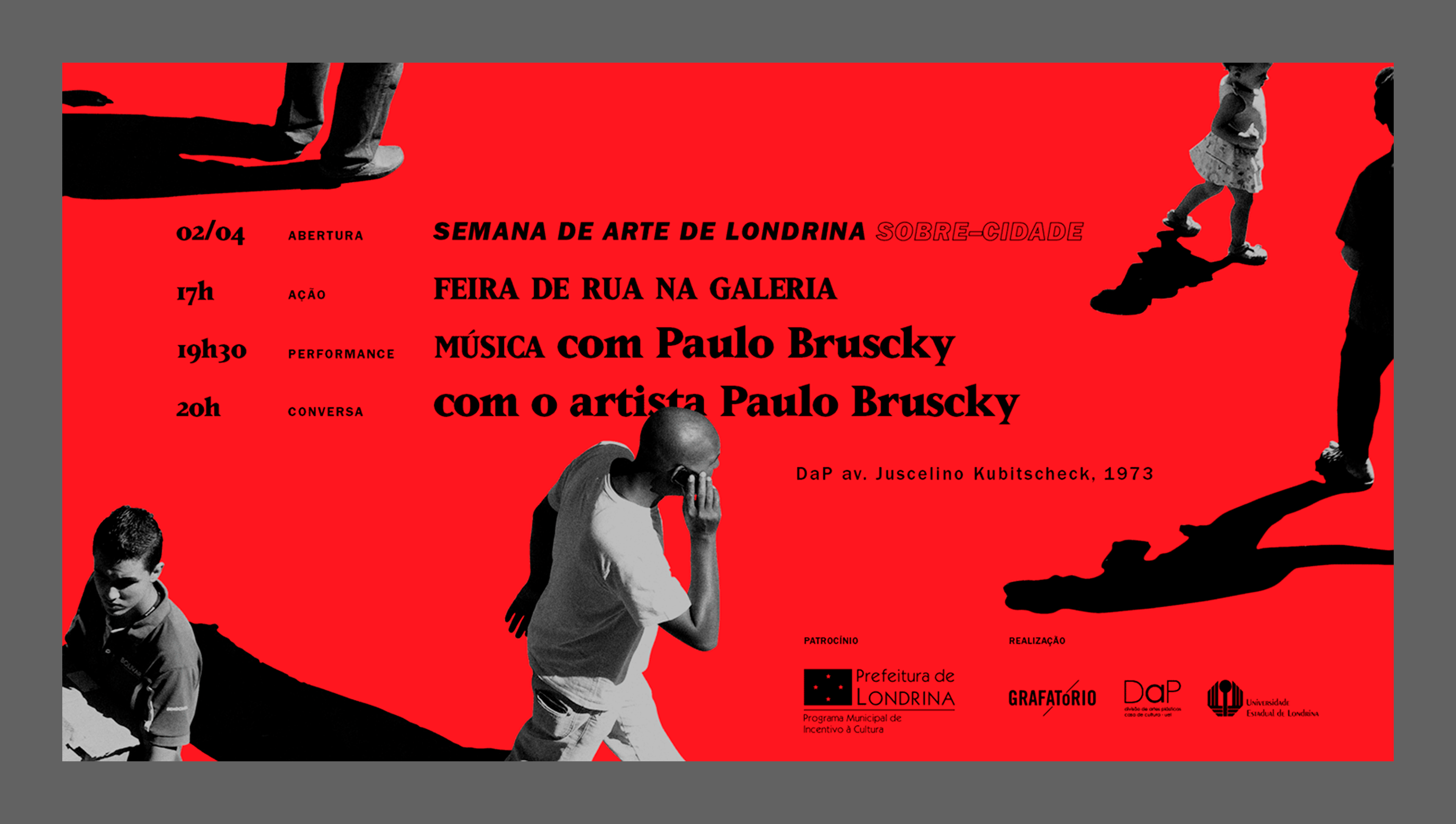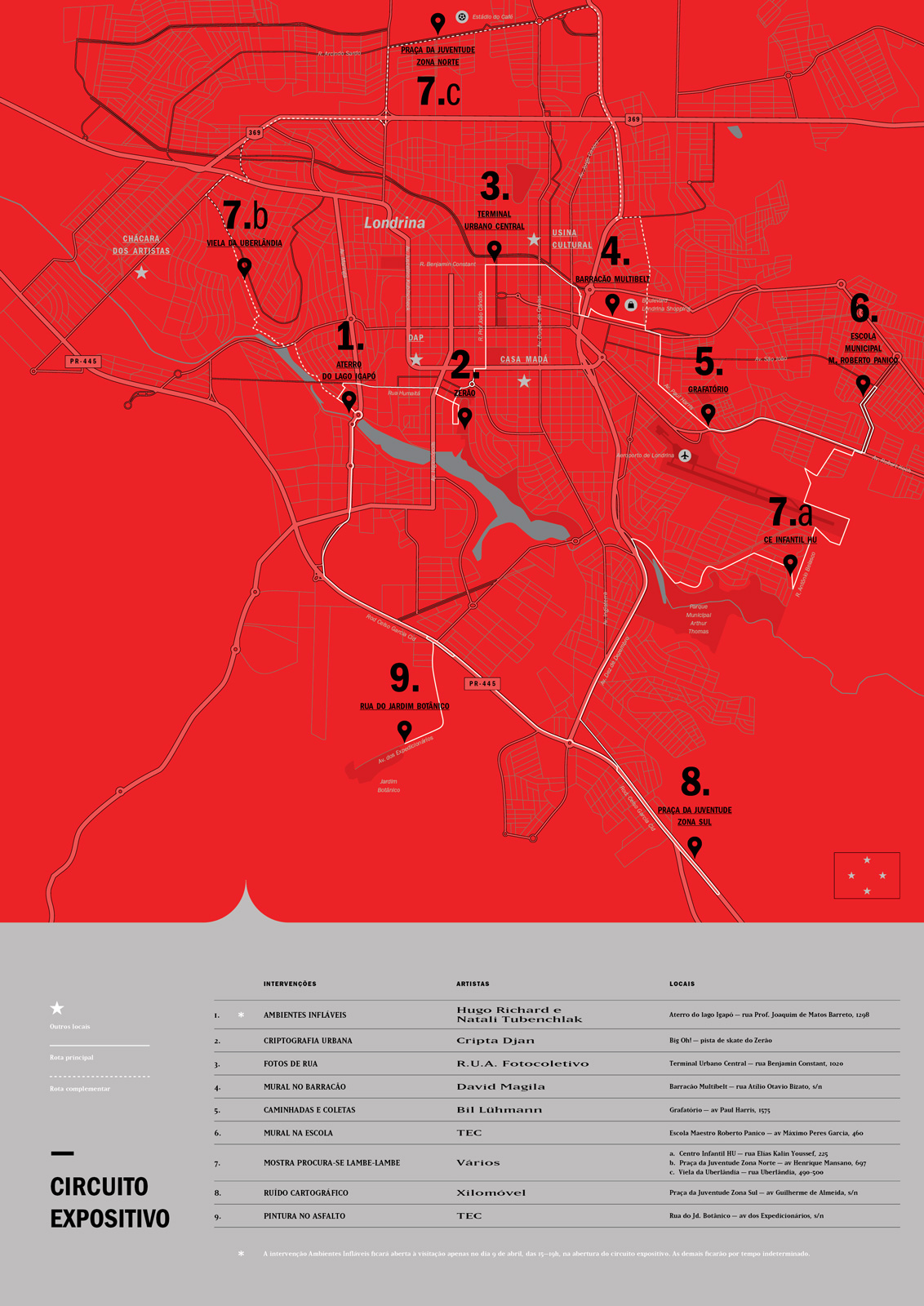 Thinking and doing about Londrina based on the concerns of artists and collectives: Paulo Bruscky, TEC, Cripta Djan, Coletivo Cãosemplumas, Bil Lühmann, David Magila, R.U.A. Fotocoletivo, Xilomóvel, Hugo Richard, and Natali Tubenchlak. A week of urban interventions and reflections on existing aesthetically in the city.
